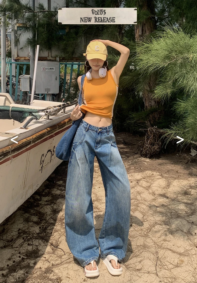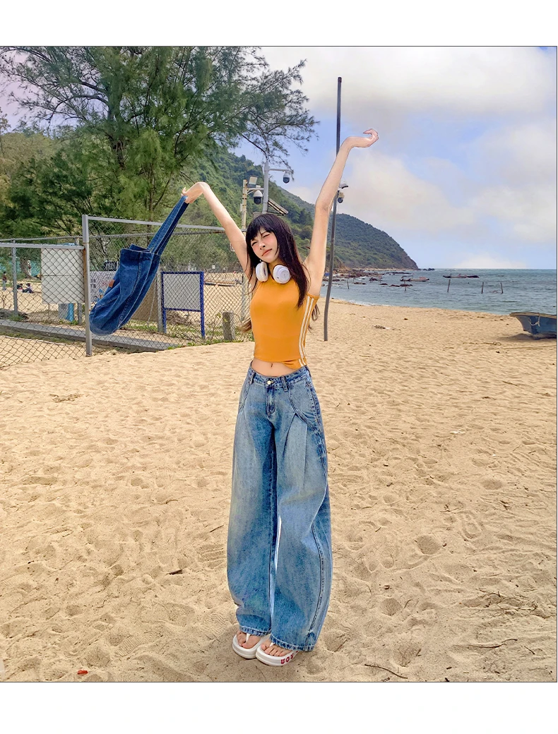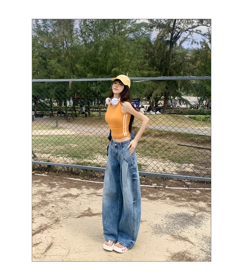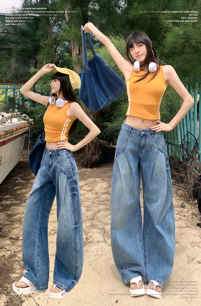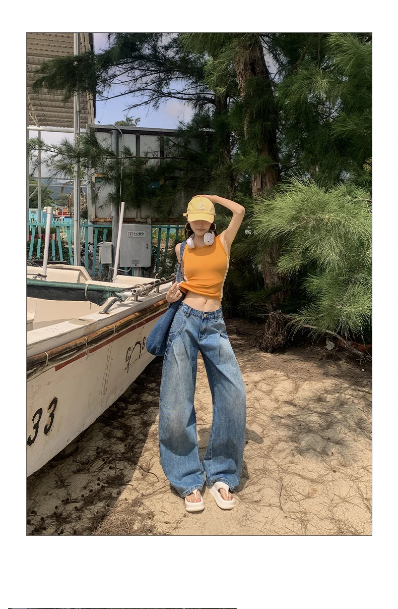 American Retro Street Style Curved Blade Loose Fit Jeans, Versatile Denim Jeans, New Spring/Summer Style, Floor-Length Pants
