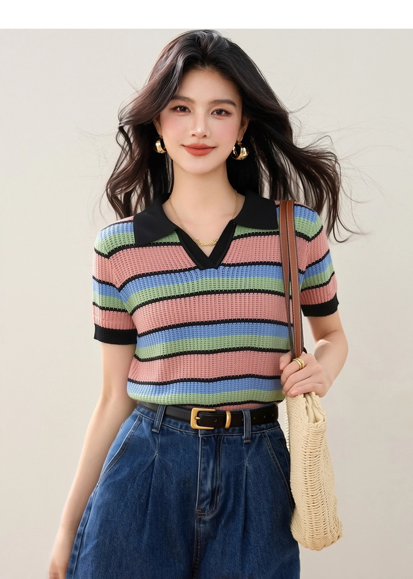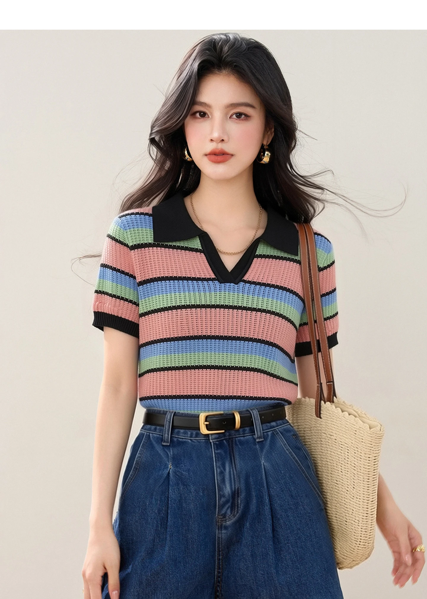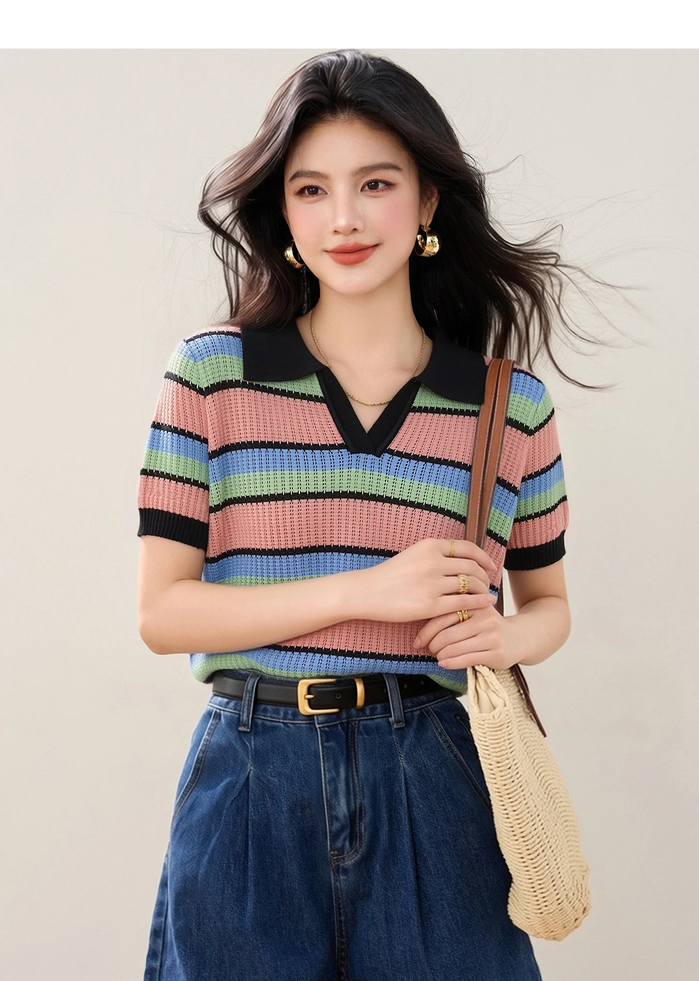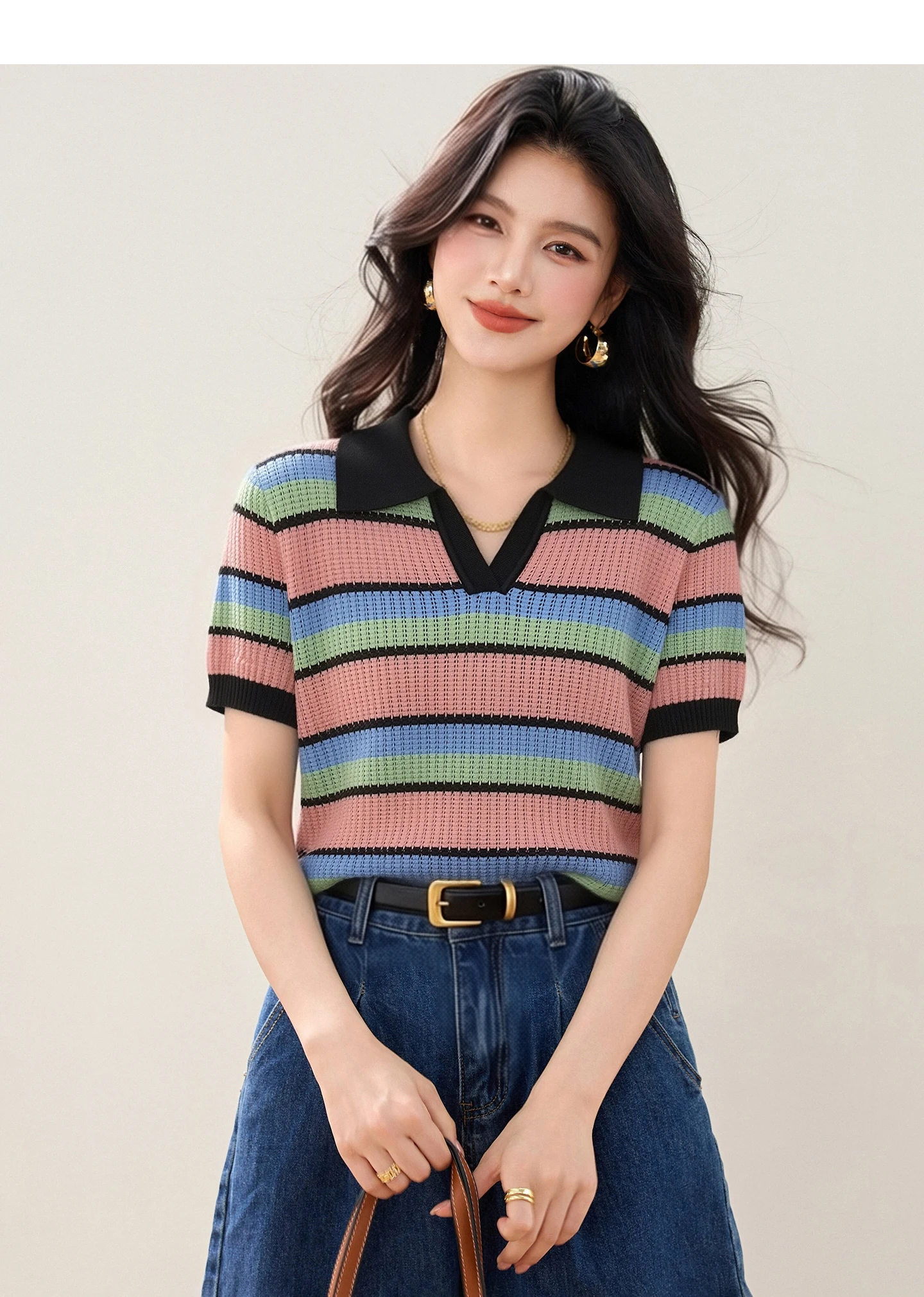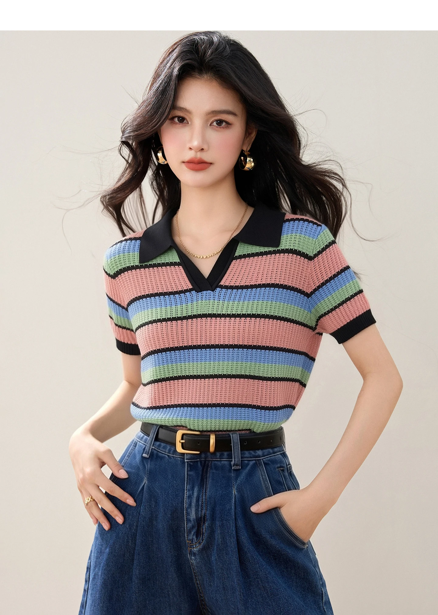 Color-block Striped V-neck Sweet Chic Cropped Top, Women's Fashion Casual Polo Shirt, Korean Style Trendy Casual Women's T-shirt