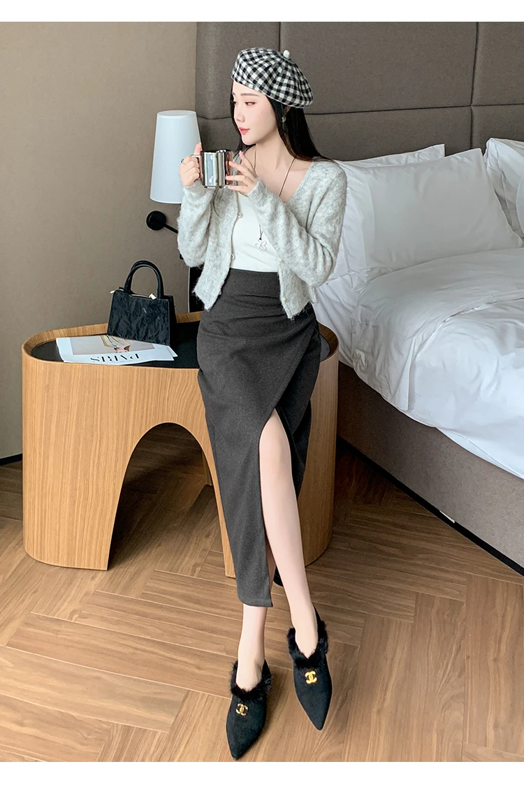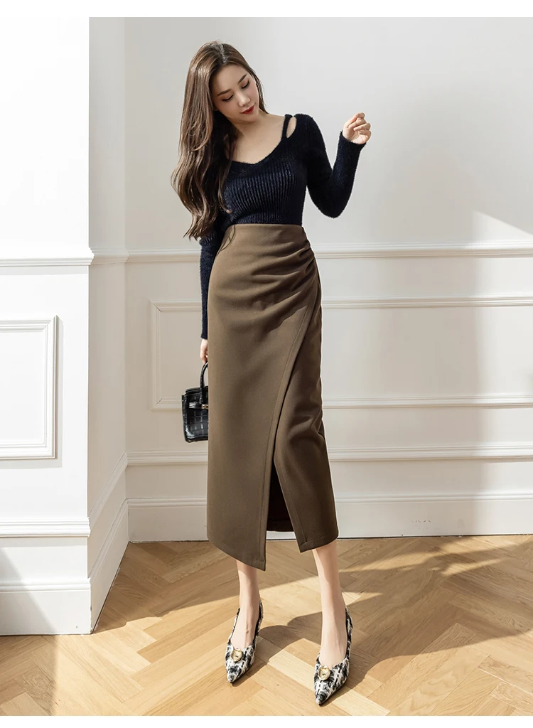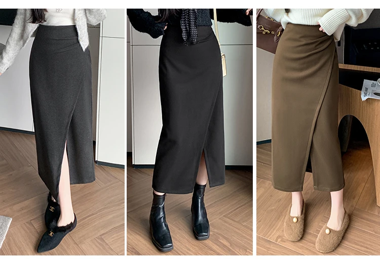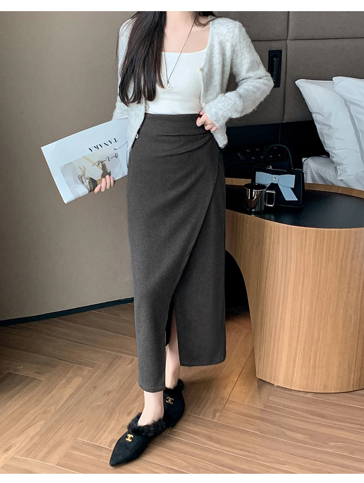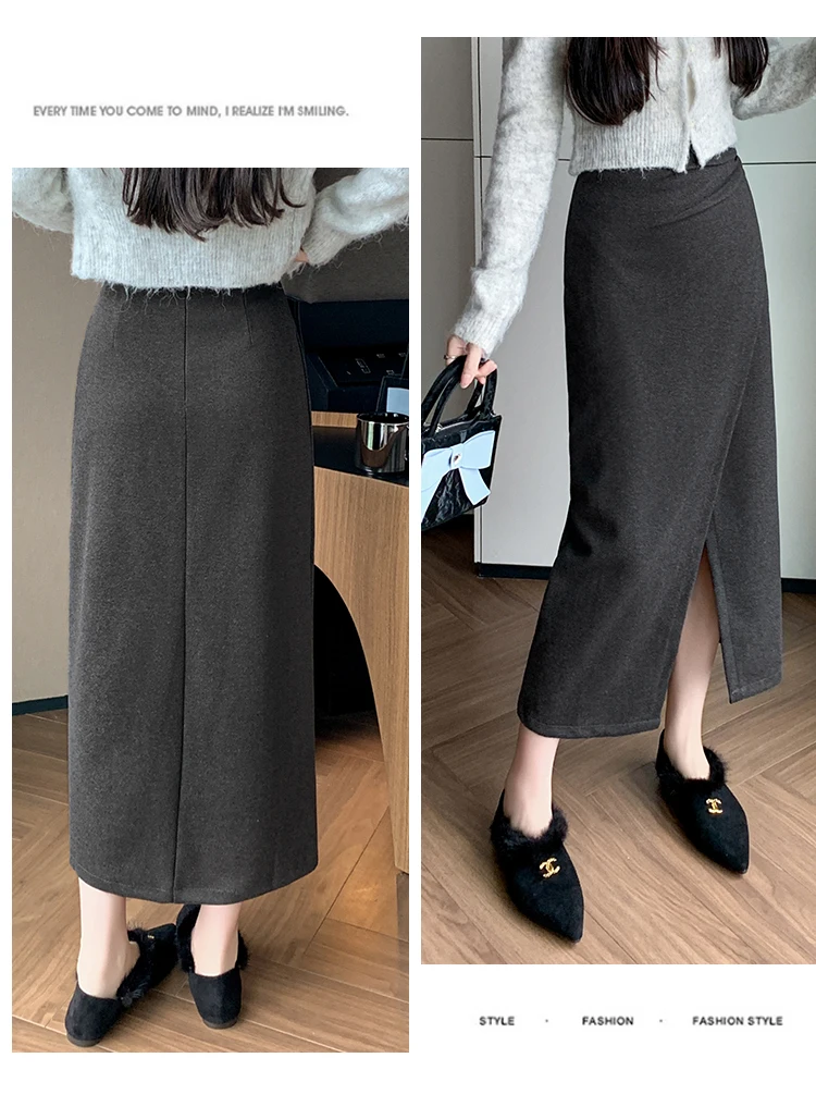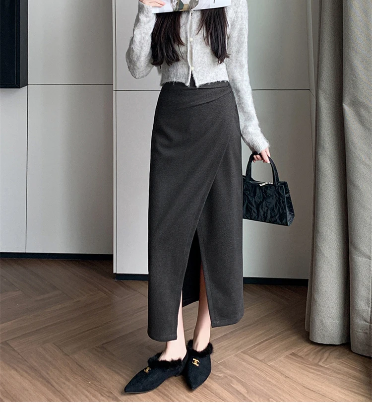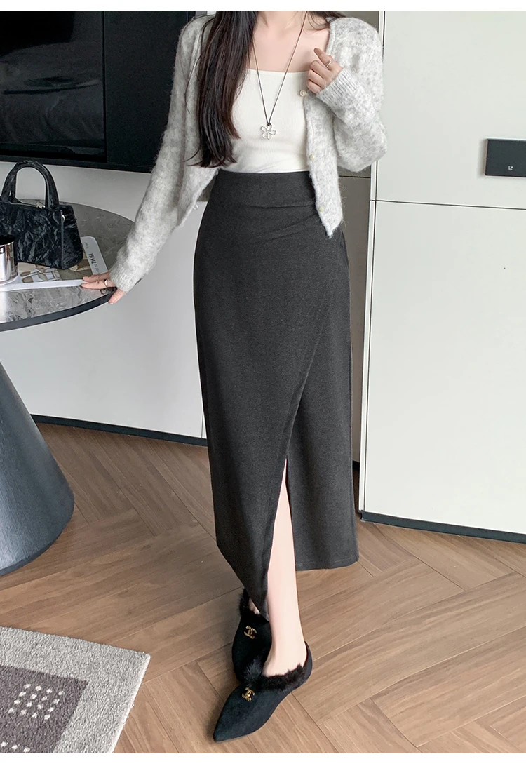 Fashion Korean Winter Woolen Midi Skirt Women Sexy Side Slit Crossed Bodycon Pencil Skirts Elegant High Waist Wrap Faldas Largas