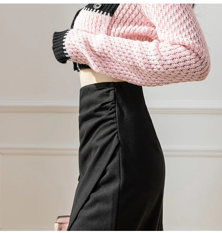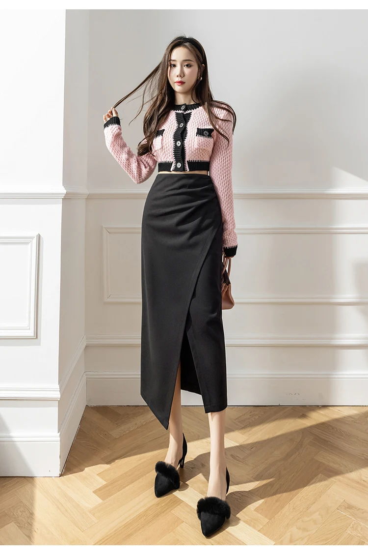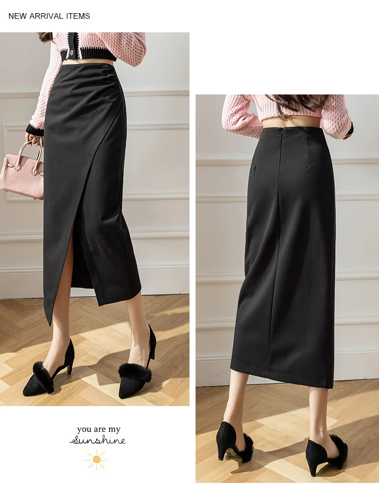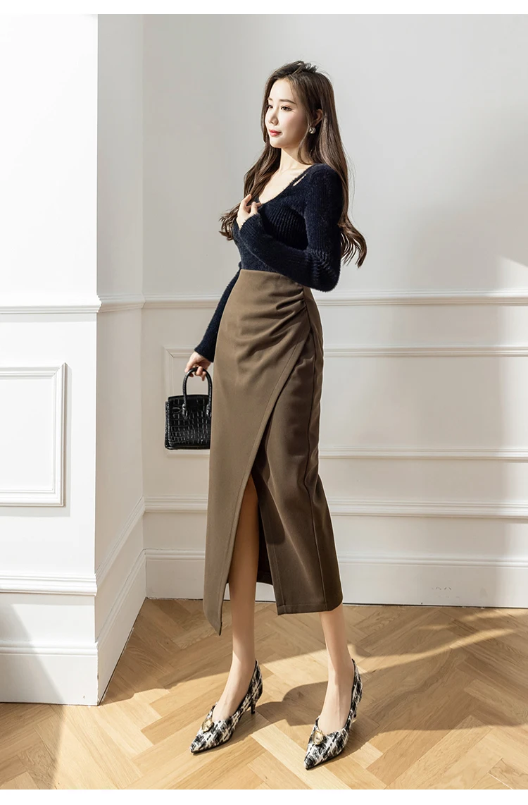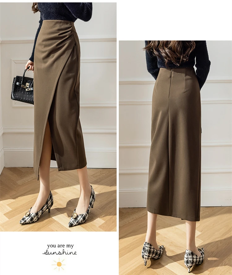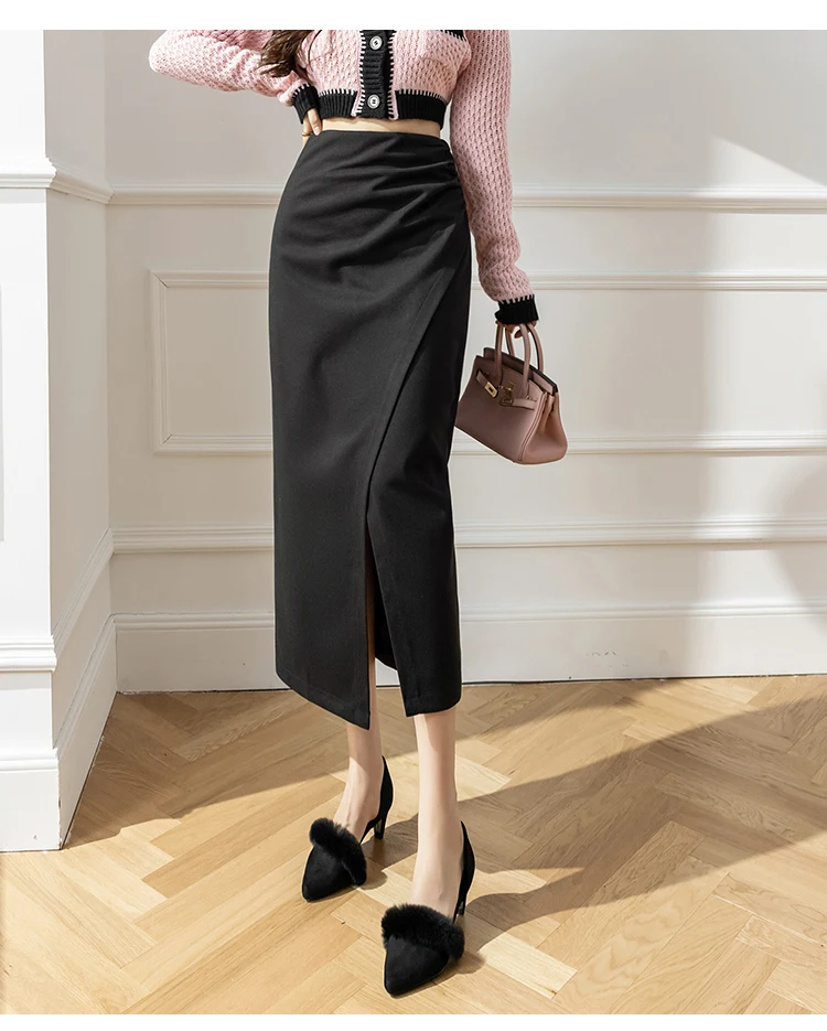 Fashion Korean Winter Woolen Midi Skirt Women Sexy Side Slit Crossed Bodycon Pencil Skirts Elegant High Waist Wrap Faldas Largas