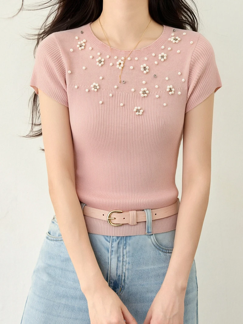 New Summer Pearl Flower Beaded Crew Neck Minimalist T-Shirt Women's Fashion Slim Fit Casual Short Sleeve Top