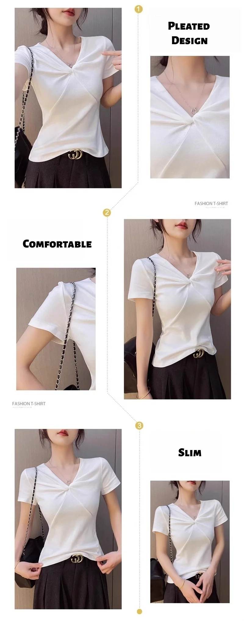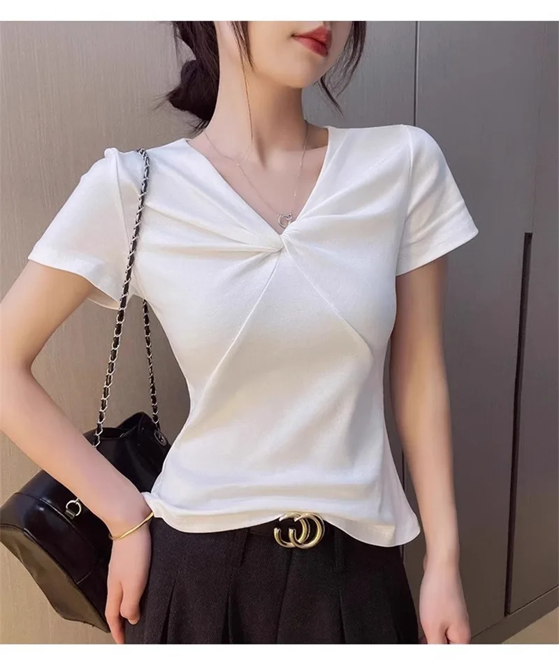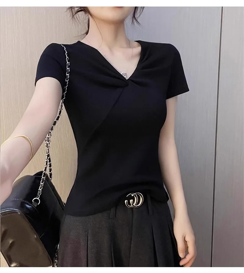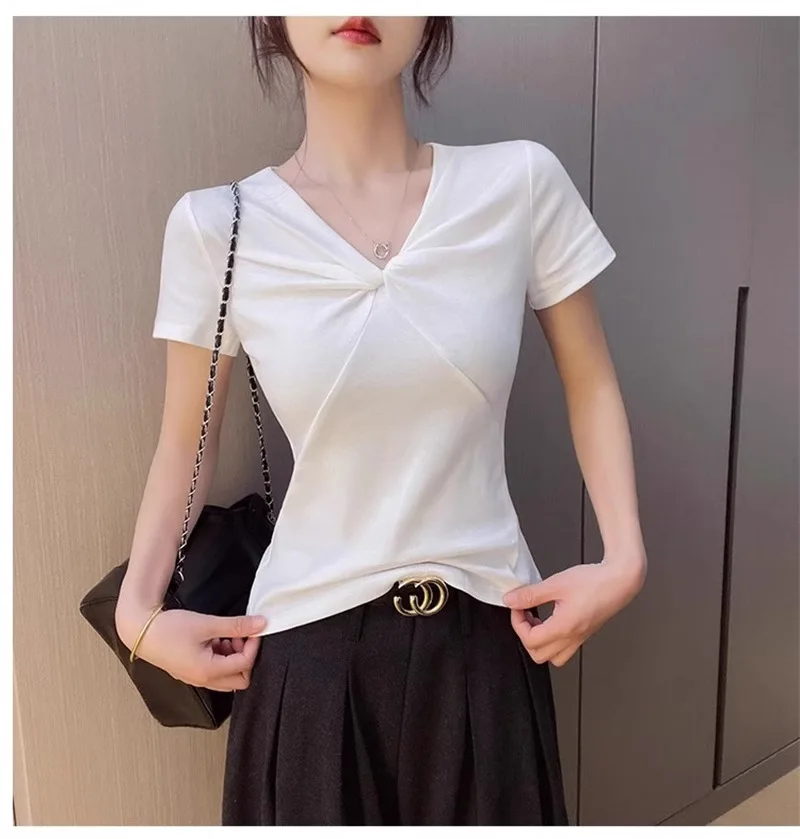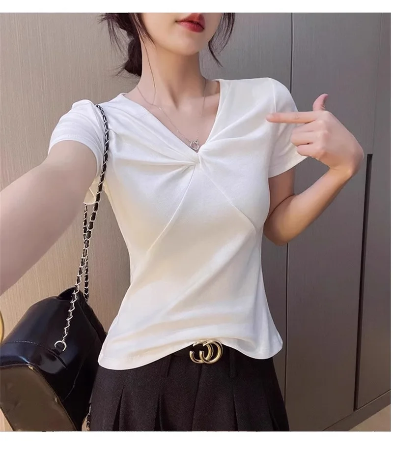 Summer V-neck Crew Neck T-Shirt: Minimalist Design, Twisted Detail, Slim-Fit, Slimming Top, Trendy Ribbed Stretch Fabric