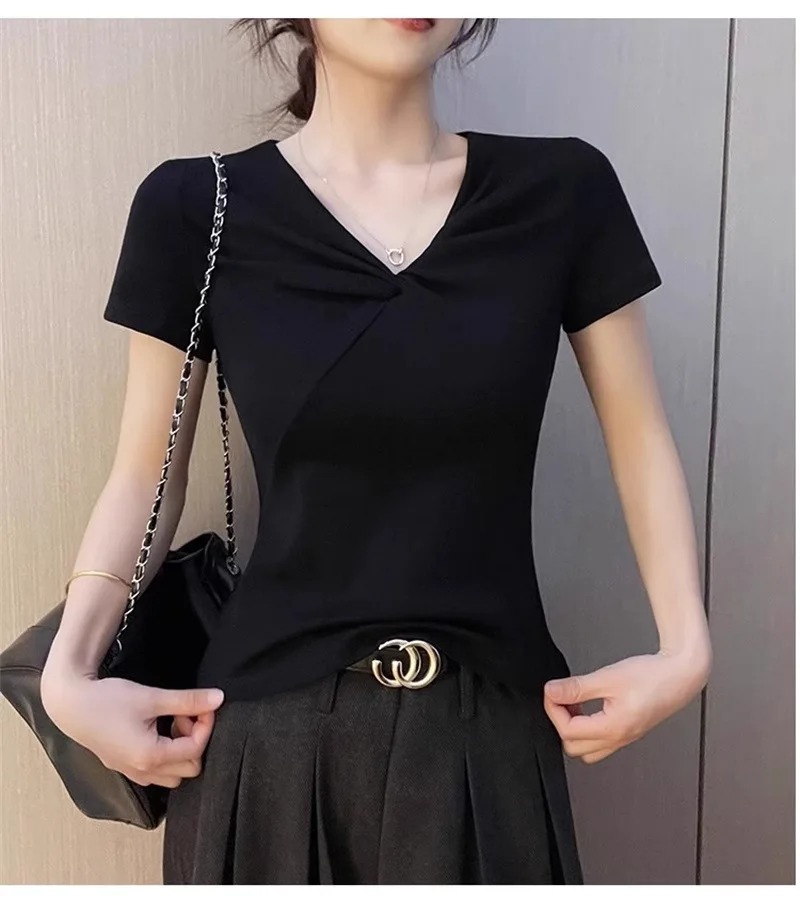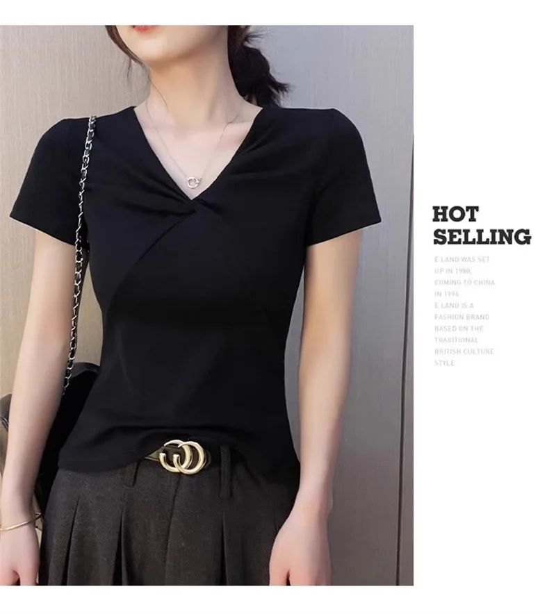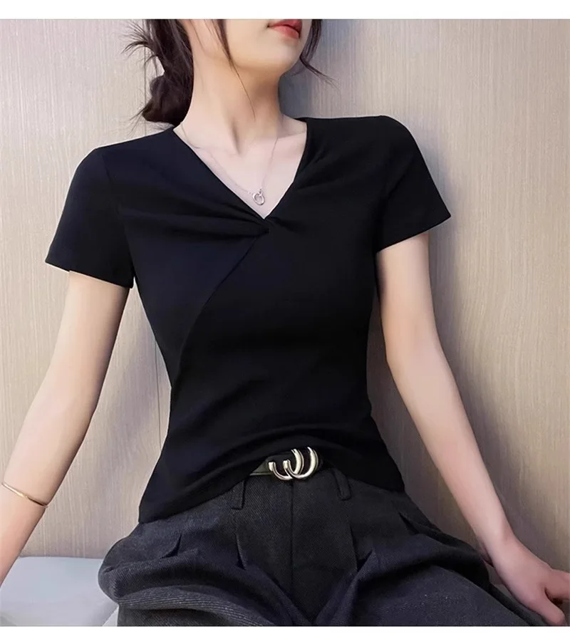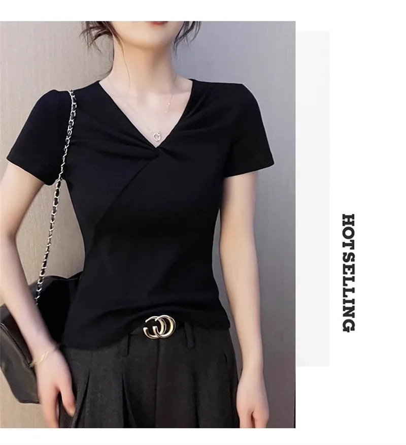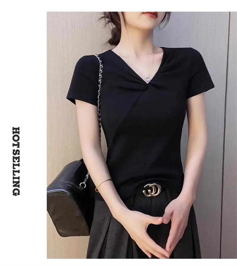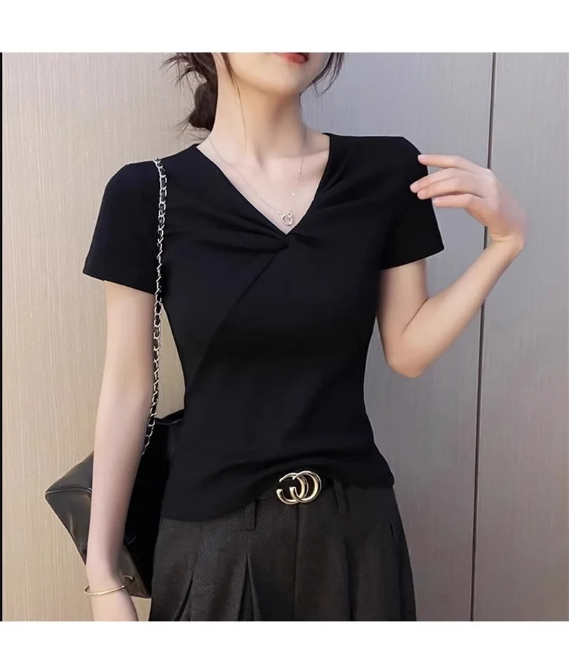 Summer V-neck Crew Neck T-Shirt: Minimalist Design, Twisted Detail, Slim-Fit, Slimming Top, Trendy Ribbed Stretch Fabric