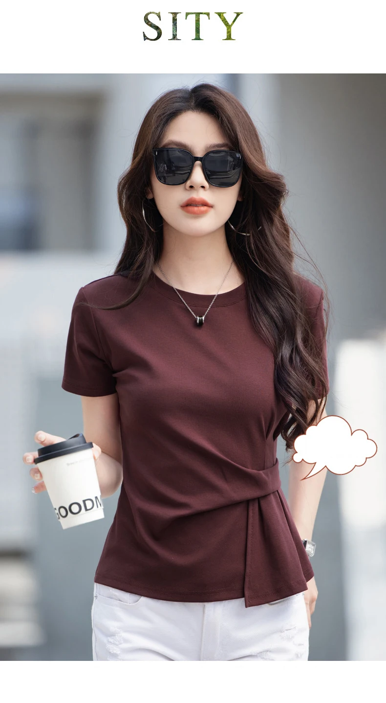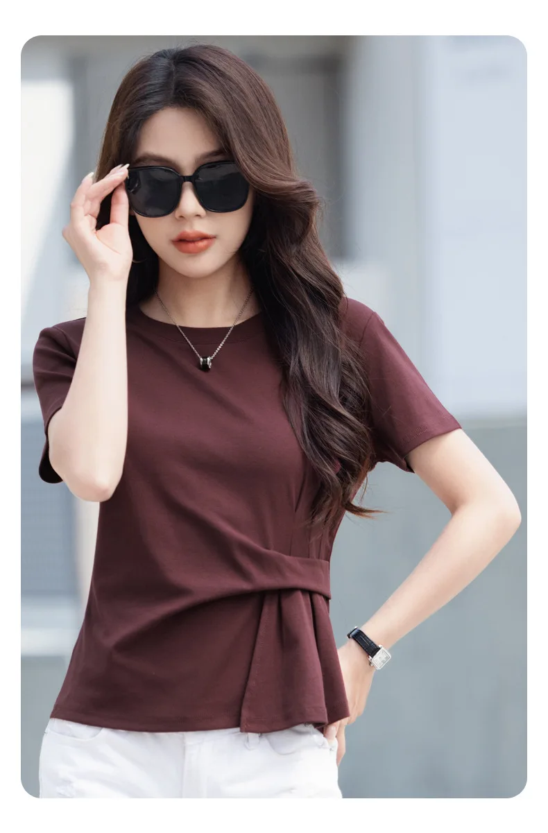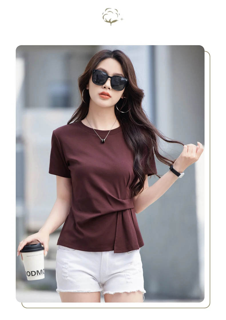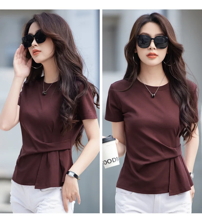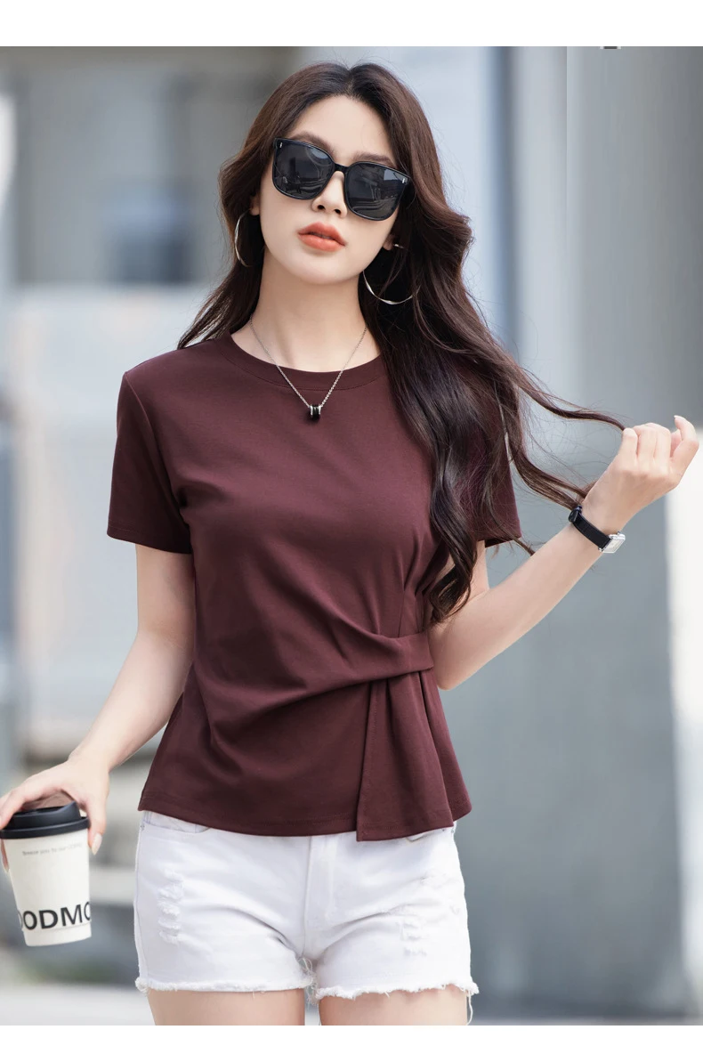 Wine red short sleeved T-shirt for women's summer new high-end cotton fashion plus size irregular round neck casual top