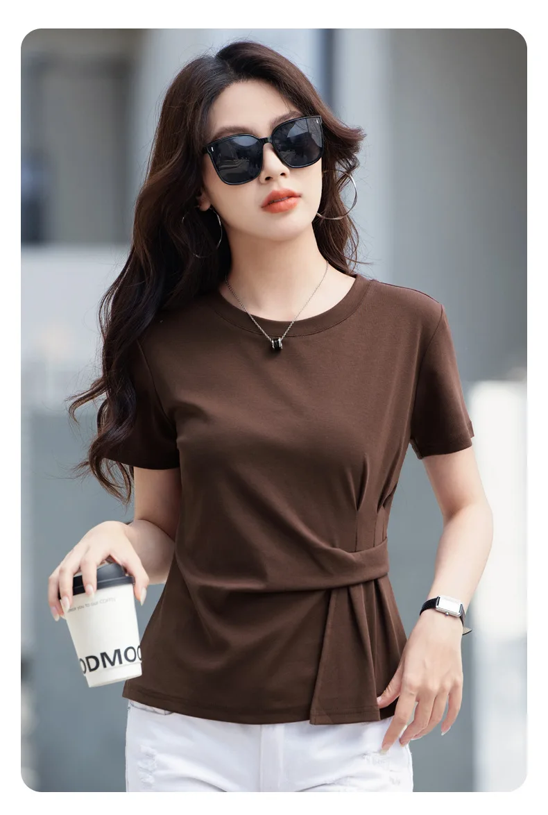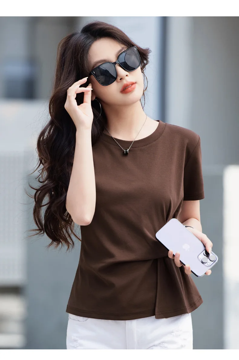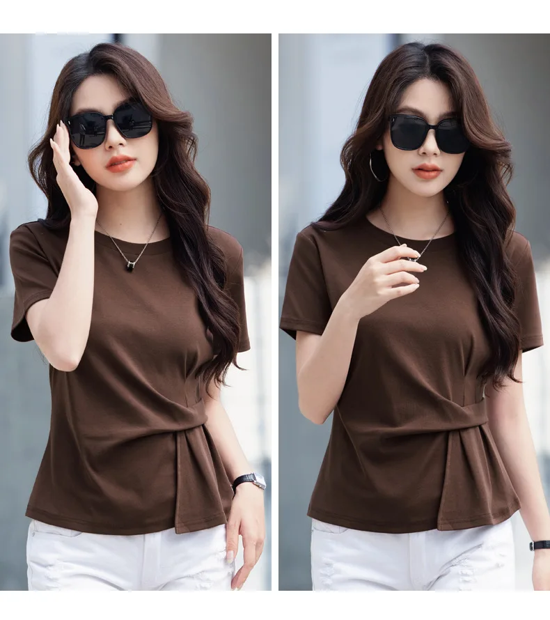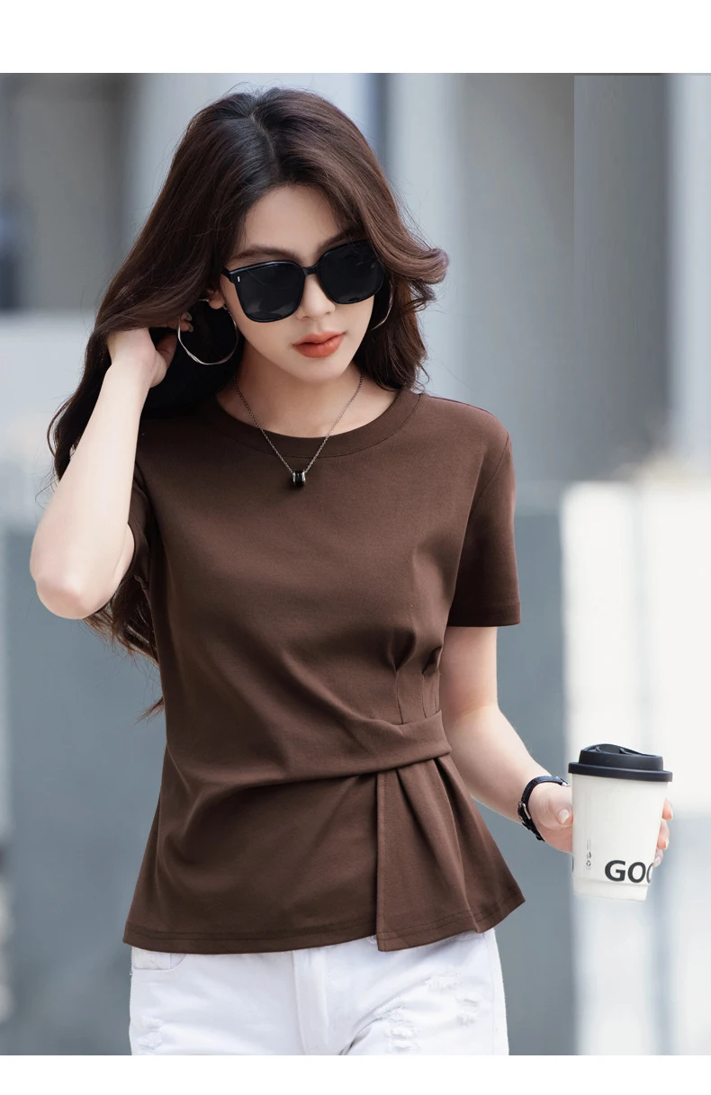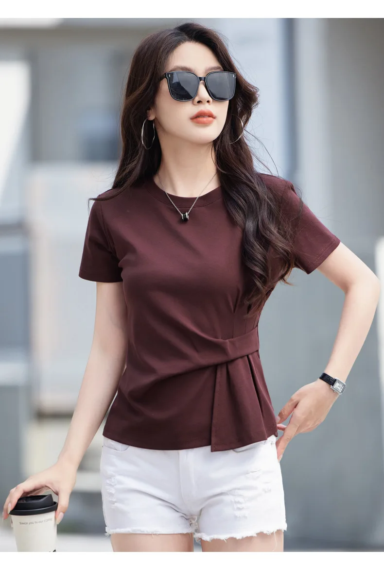 Wine red short sleeved T-shirt for women's summer new high-end cotton fashion plus size irregular round neck casual top