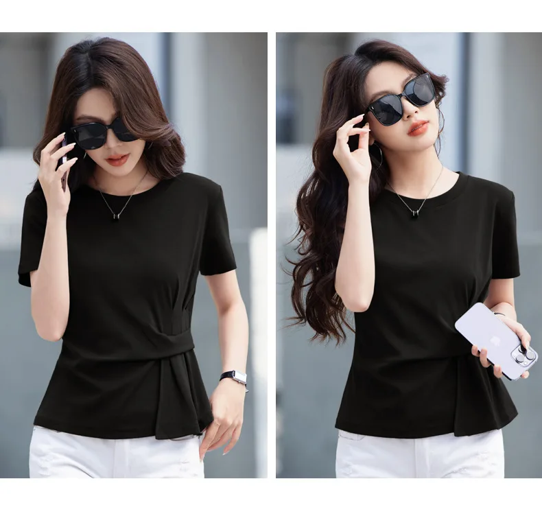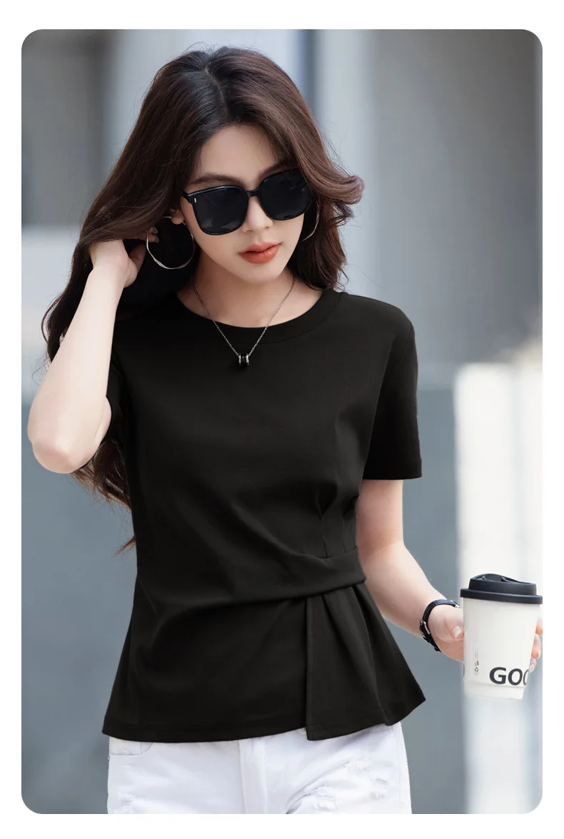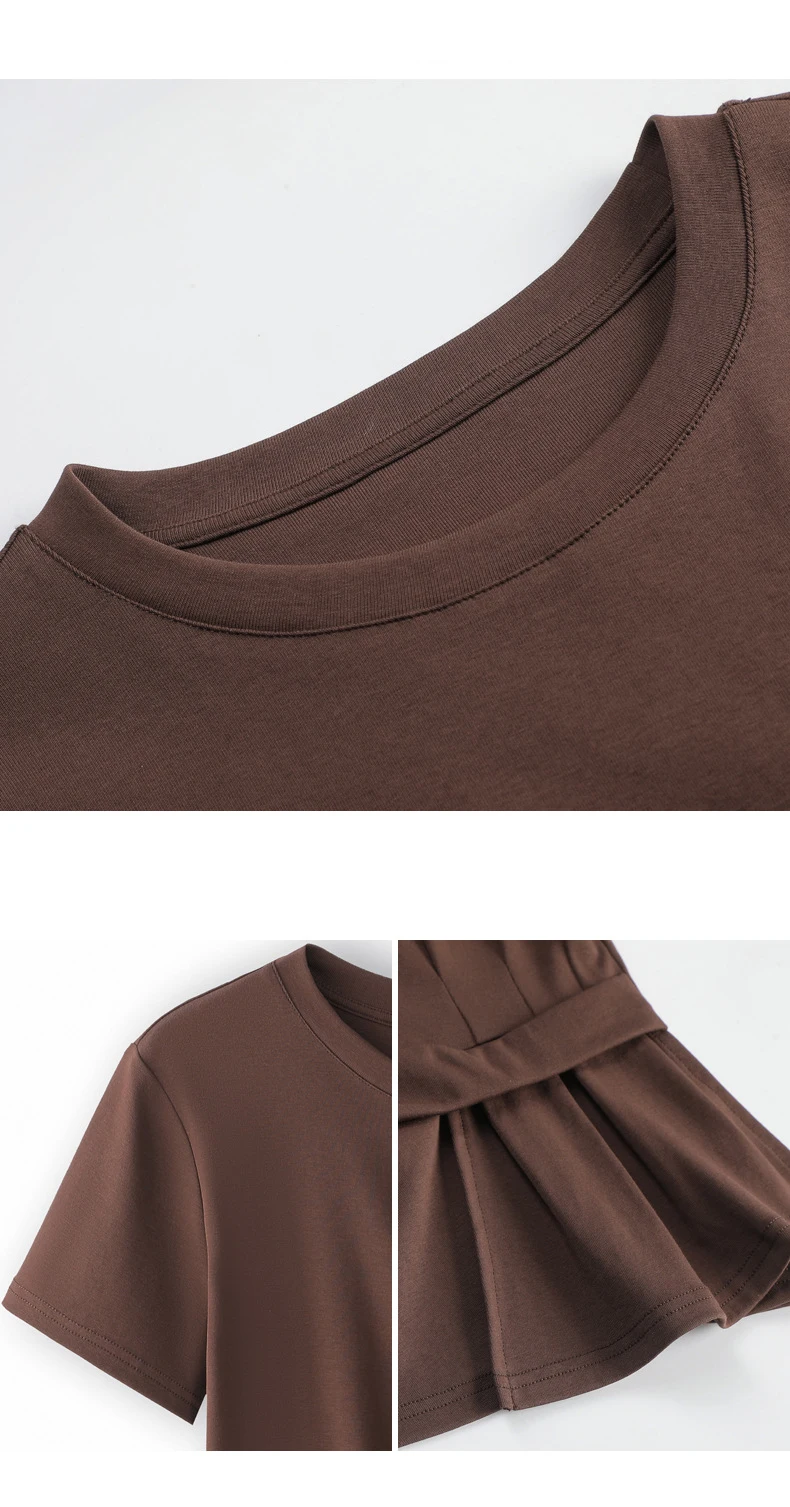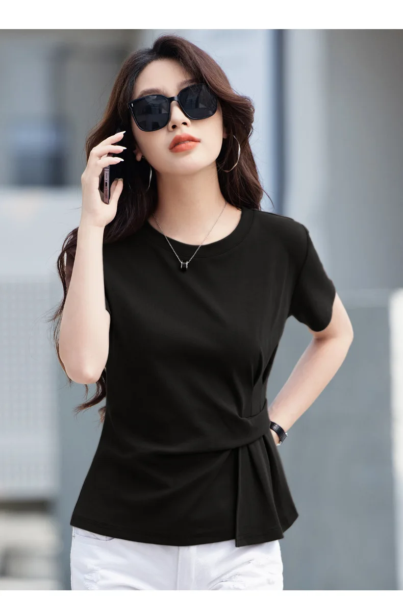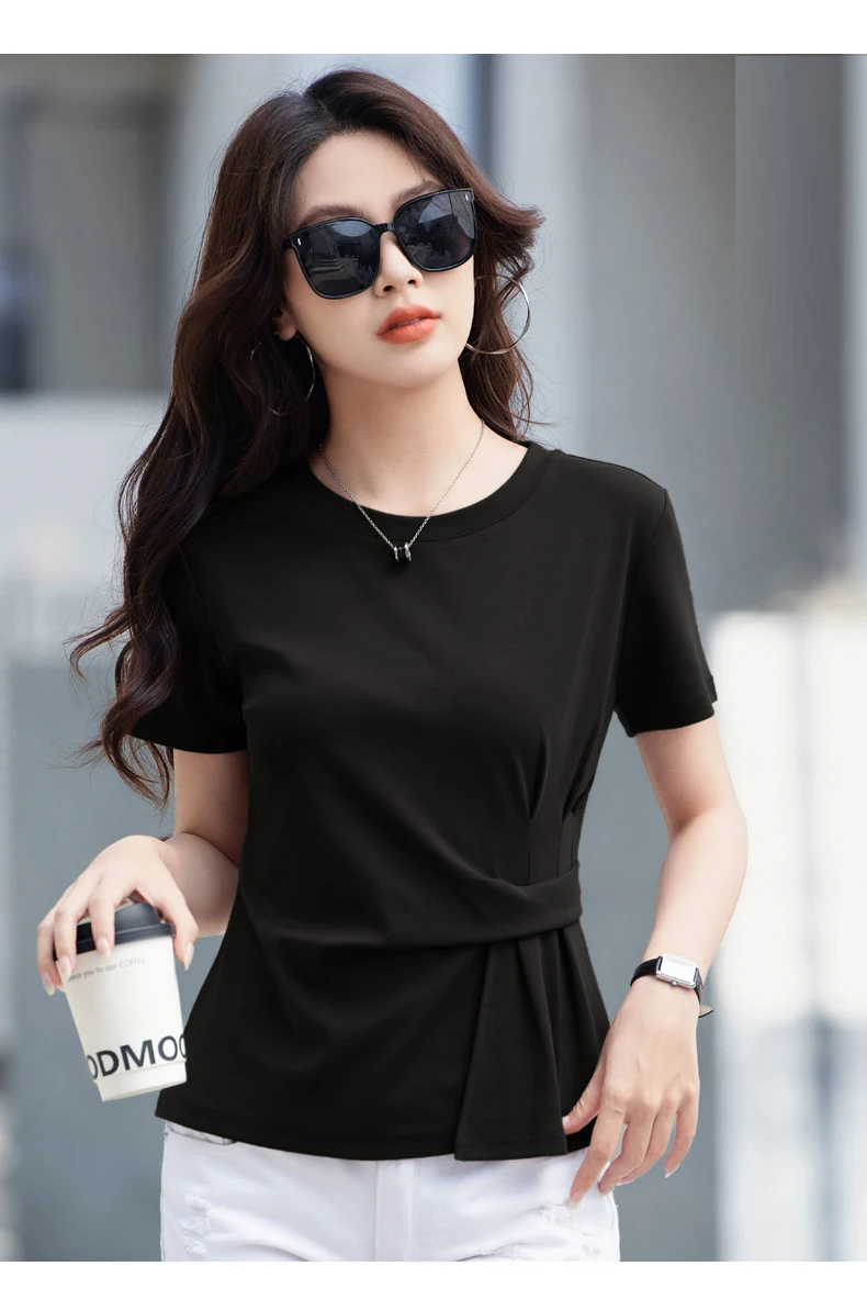 Wine red short sleeved T-shirt for women's summer new high-end cotton fashion plus size irregular round neck casual top